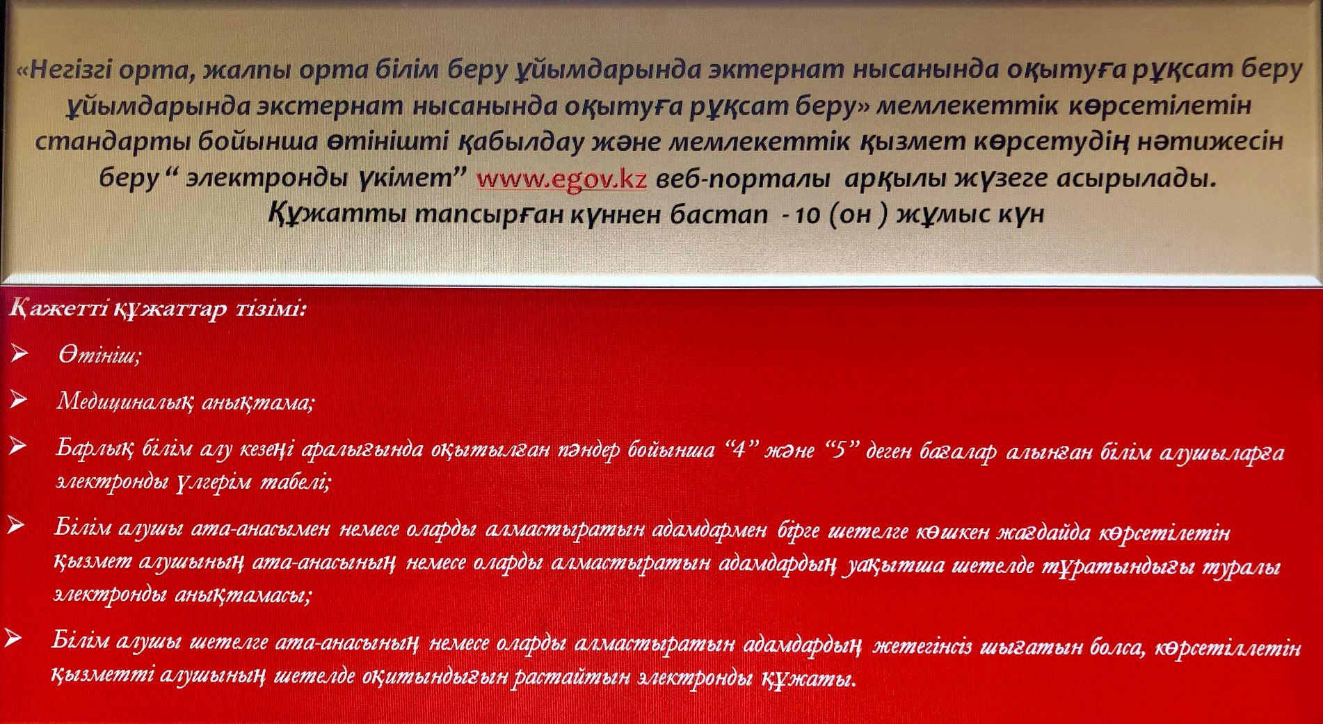 «Негізгі орта, жалпы орта білім беру ұйымдарында экстернат нысанында оқуға рұқсат беру» құжаттарды рәсімдеу тәртібі.